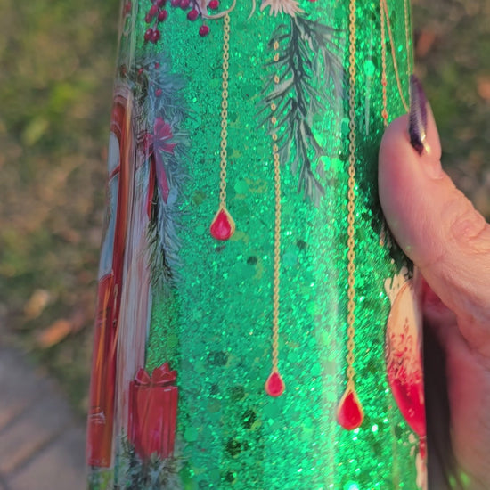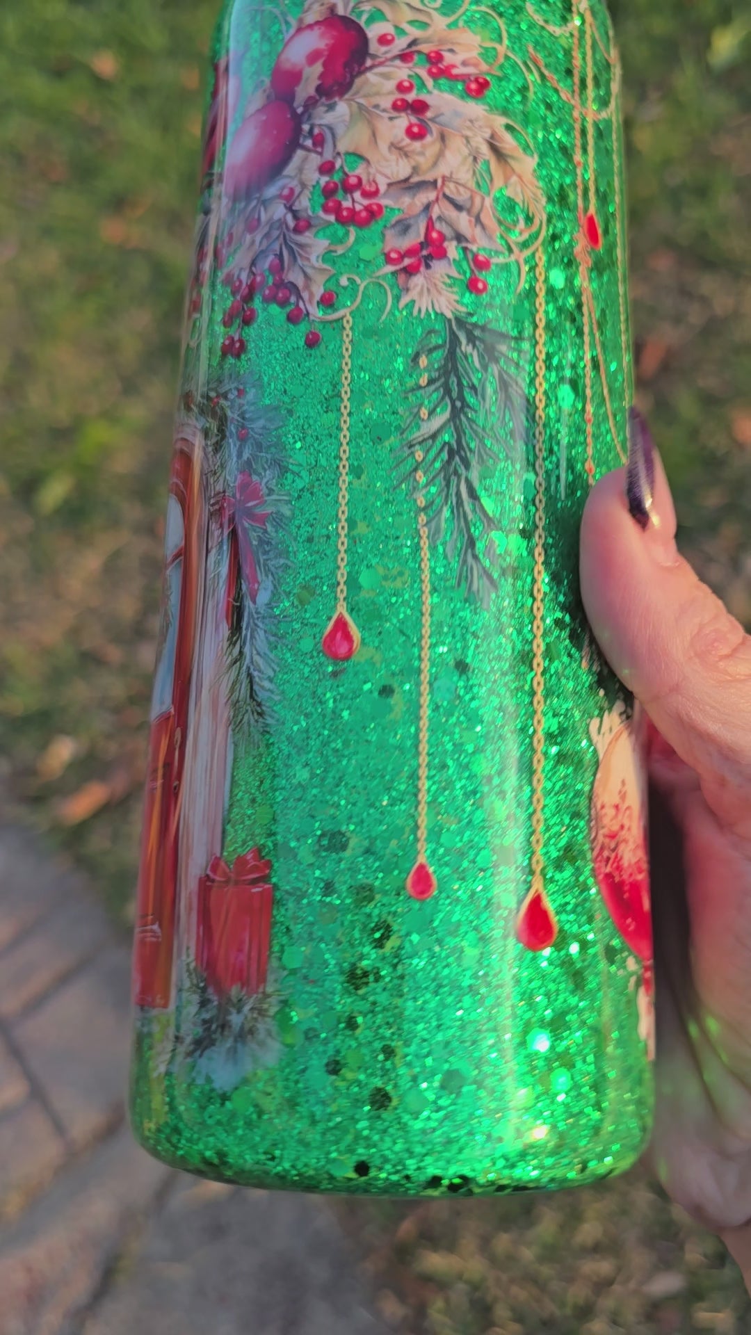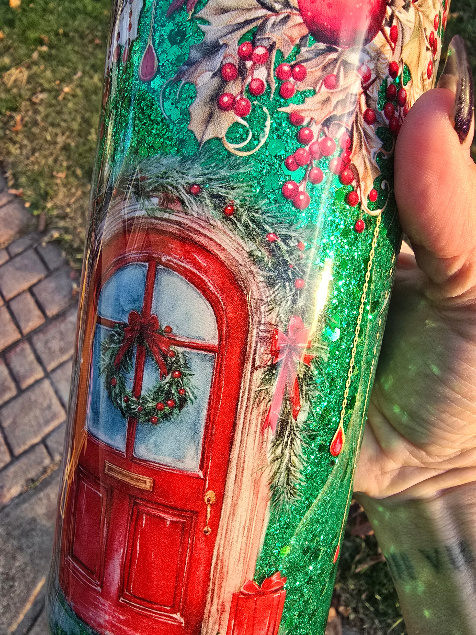 Step into the season with this 25oz double-walled tumbler featuring a red Christmas door, wreath, cardinals, and festive garland on a sparkling green glitter base. Handcrafted and perfect for cozy holiday sips or gift giving.