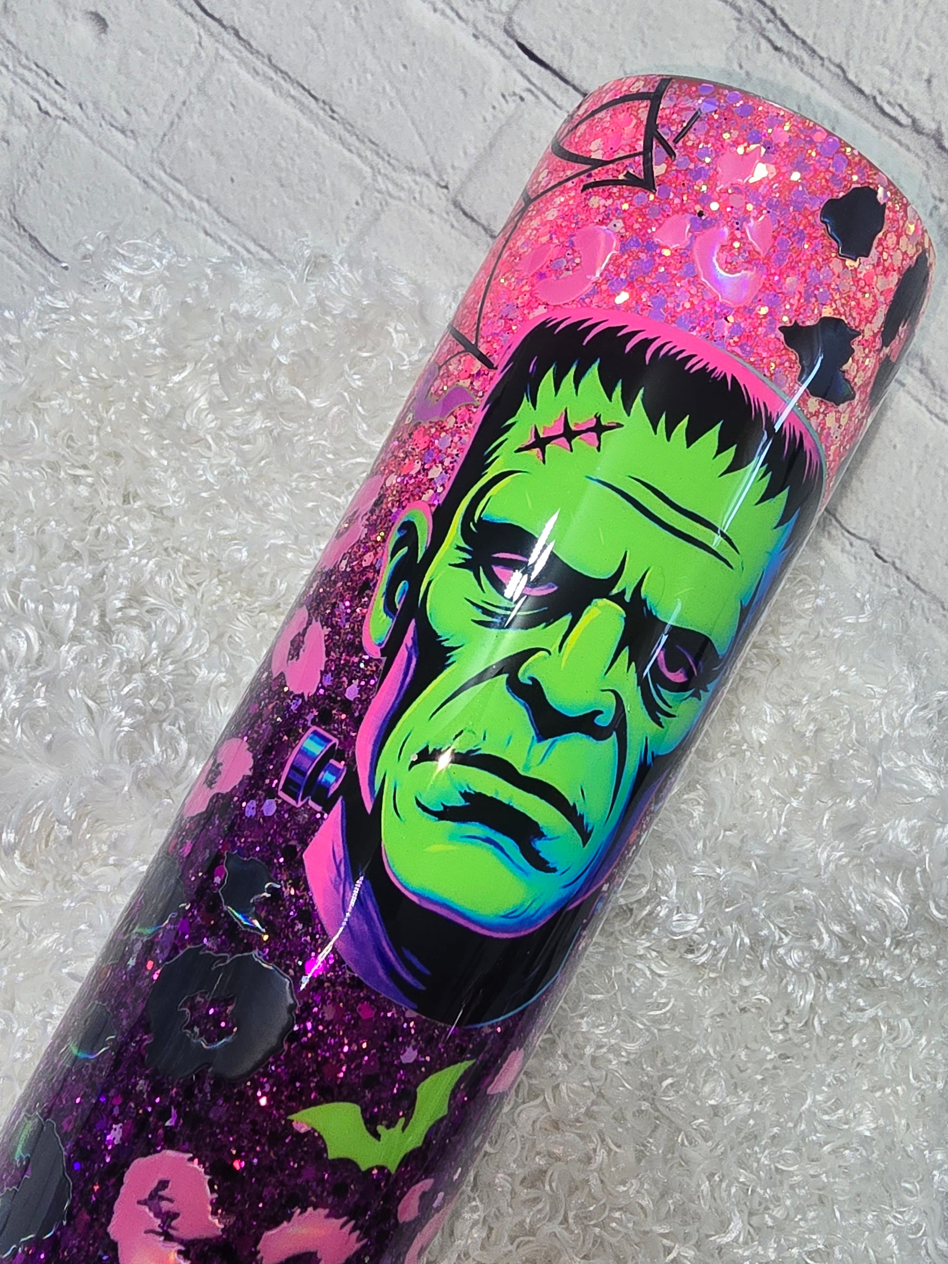 This spooky showstopper is a 30oz skinny strawbler designed to turn heads! Featuring a bold neon Frankenstein design with holographic leopard spots that shimmer under the light, it’s the perfect mix of creepy and glam. The base shifts from pink to purple, adding a pop of color that makes it one-of-a-kind. Comes with a reusable straw, double-walled for insulation to keep drinks icy cold or piping hot. Durable, lightweight, and built for everyday use—or your next Halloween party.
