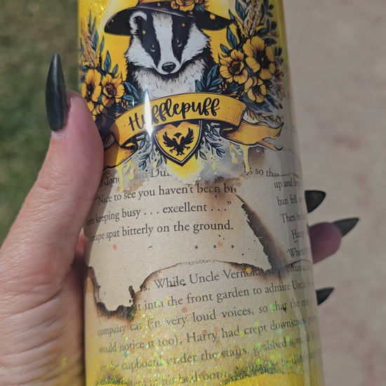 Celebrate loyalty, patience, and a love of learning with our Hufflepuff House Tumbler. This 20-ounce stainless steel double-walled cup keeps drinks icy cold or piping hot for hours. Designed in classic yellow and black Hufflepuff colors with subtle magical accents and a house-crest motif, it’s perfect for coffee, tea, or butterbeer on the go.