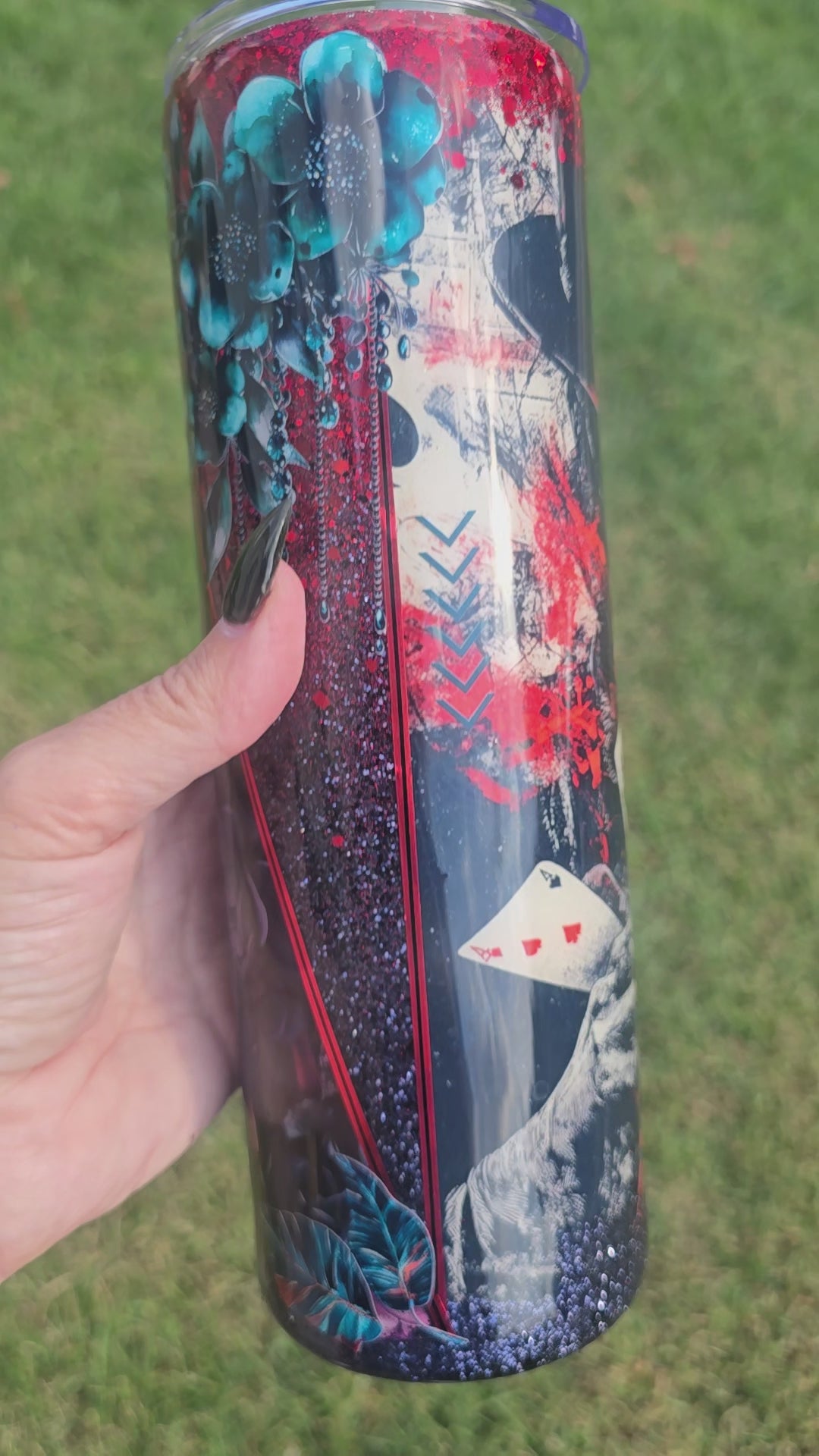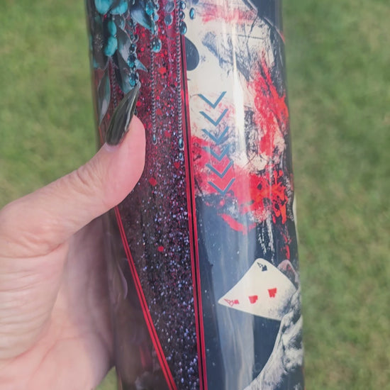 A show-stopping tumbler for lovers of bold style. This 30-ounce stainless steel double-walled beauty features a dramatic red-to-black ombre background adorned with teal flowers, playing cards, and a mysterious woman in a black hat. A little gothic, a little vintage Vegas, all gorgeous. It’s perfect for keeping big drinks cold or hot on the go.