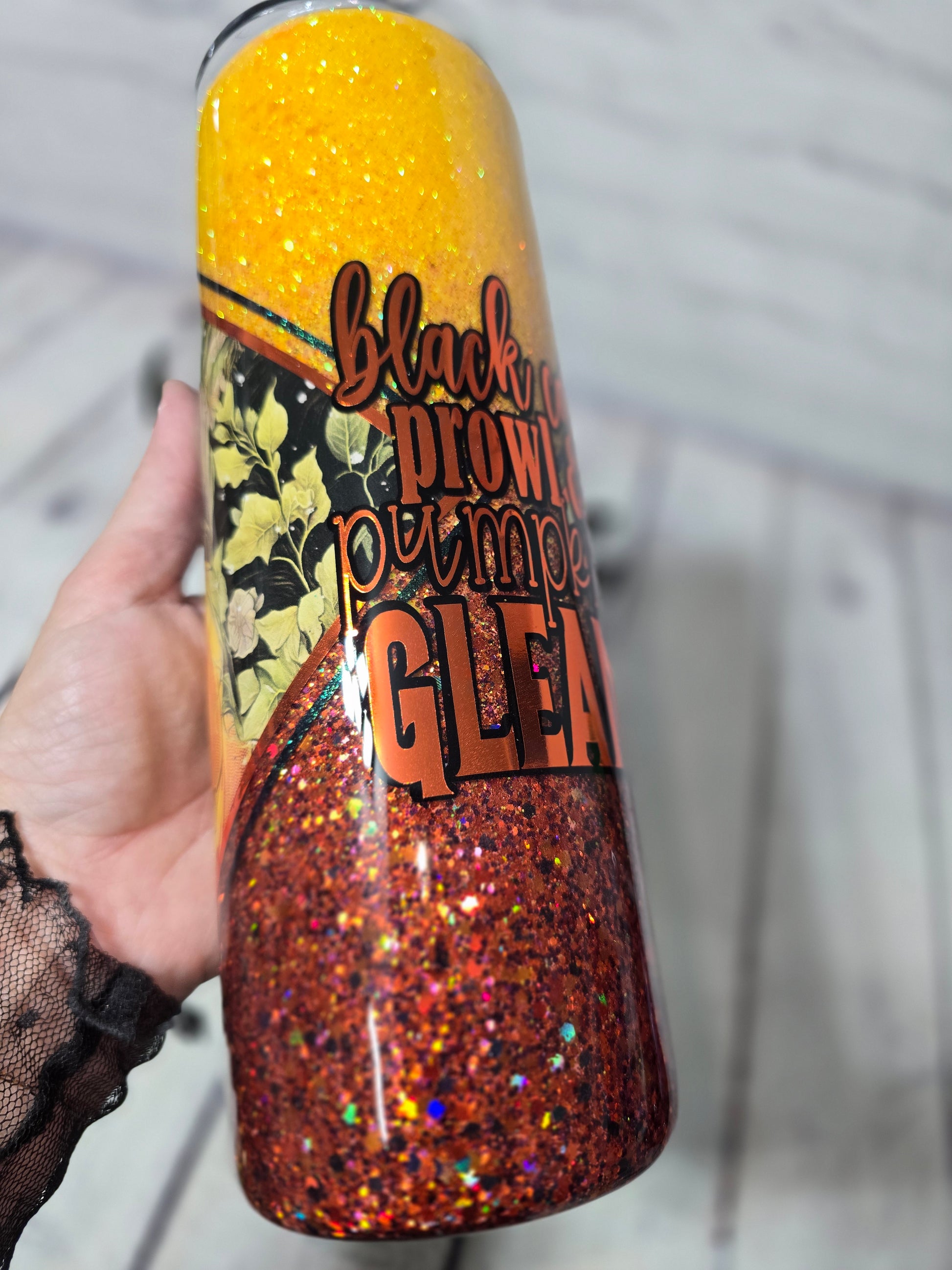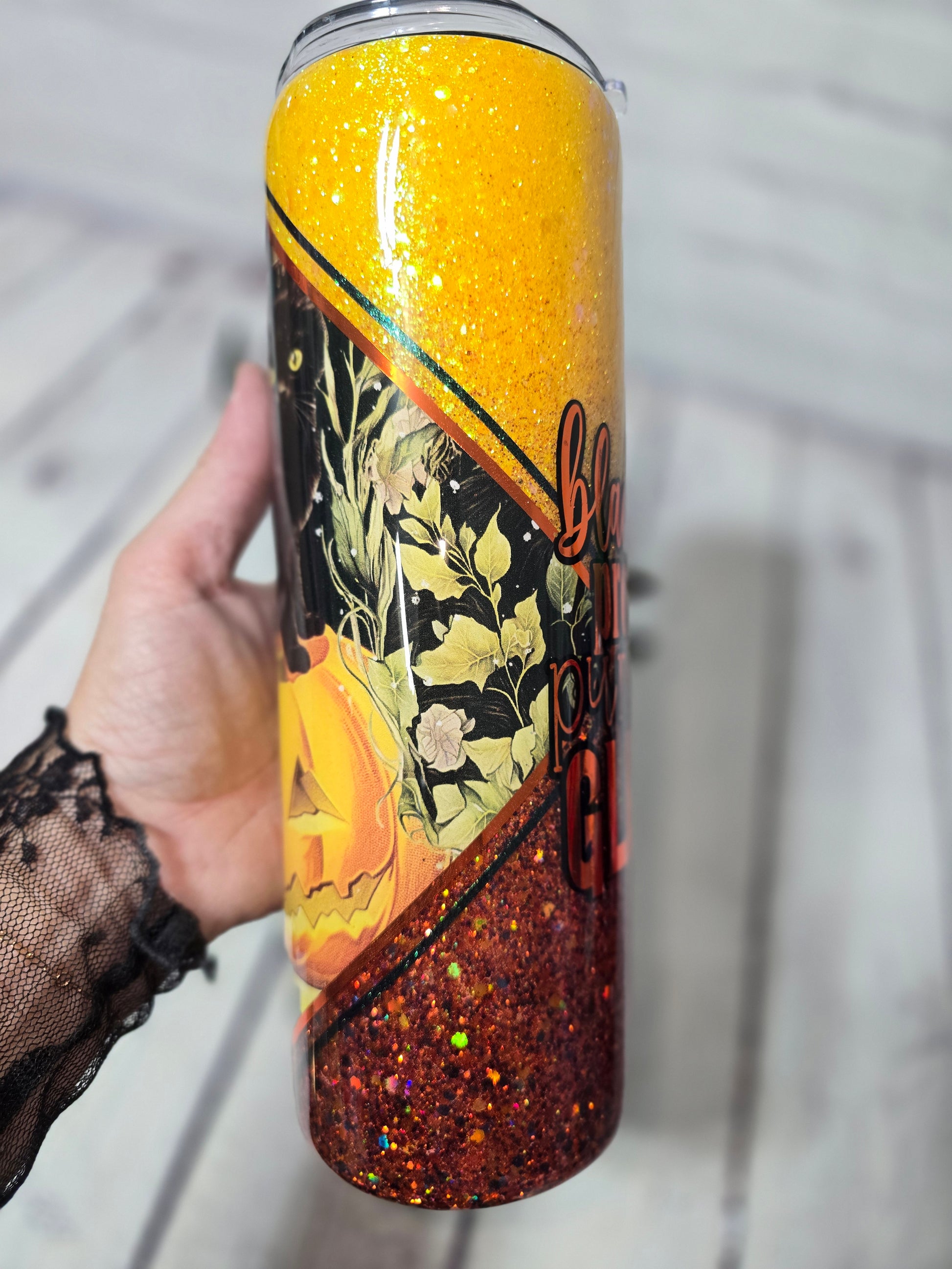 Sip your favorite drink in style with our 30oz Tumbler featuring adorable Black Cats & a Pumpkin design. Perfect for fall, this wide tumbler boasts a stunning ombre and sparkling finish. Comes with a convenient lid and straw, making it your go-to tumbler for every season.
