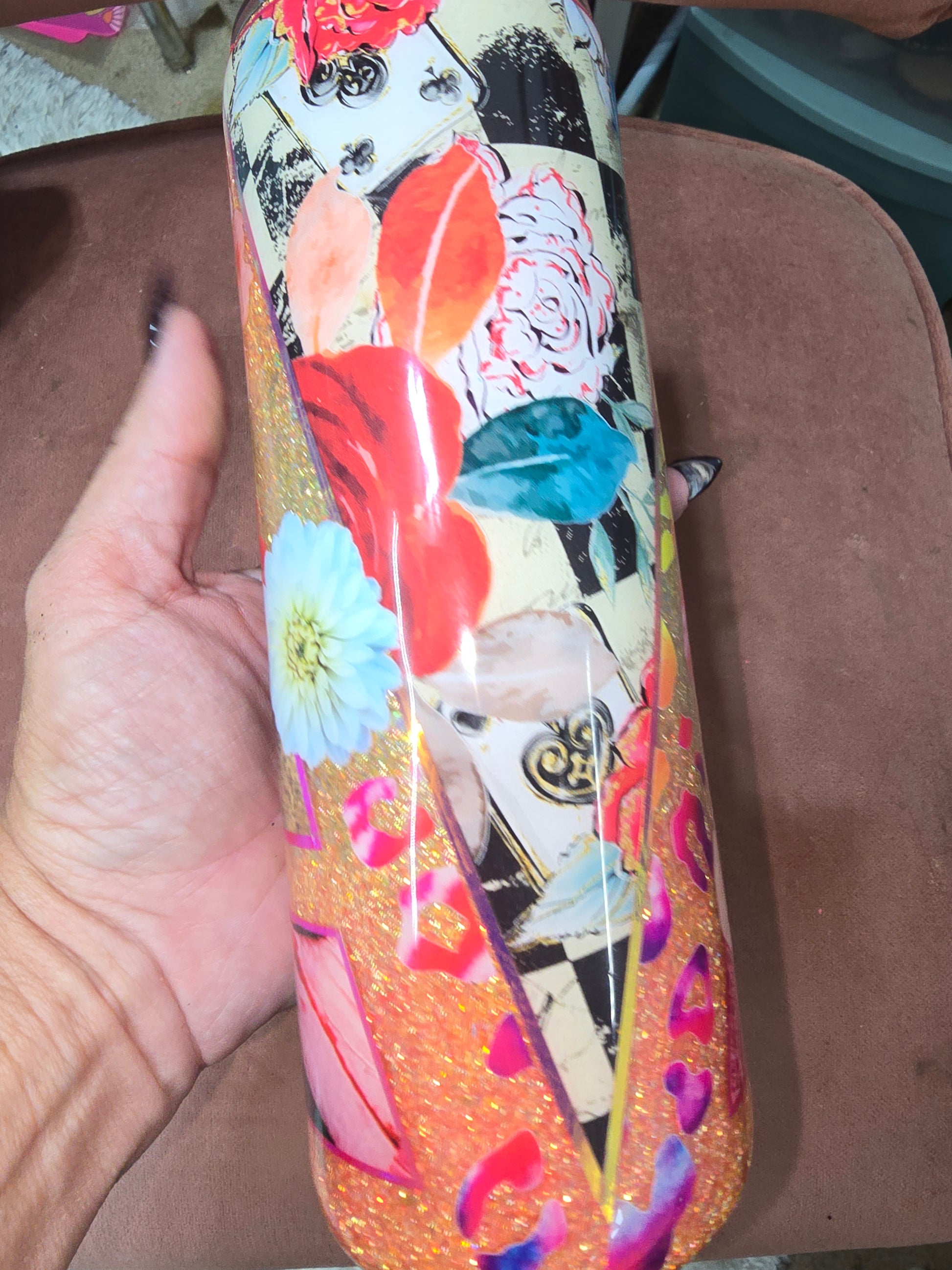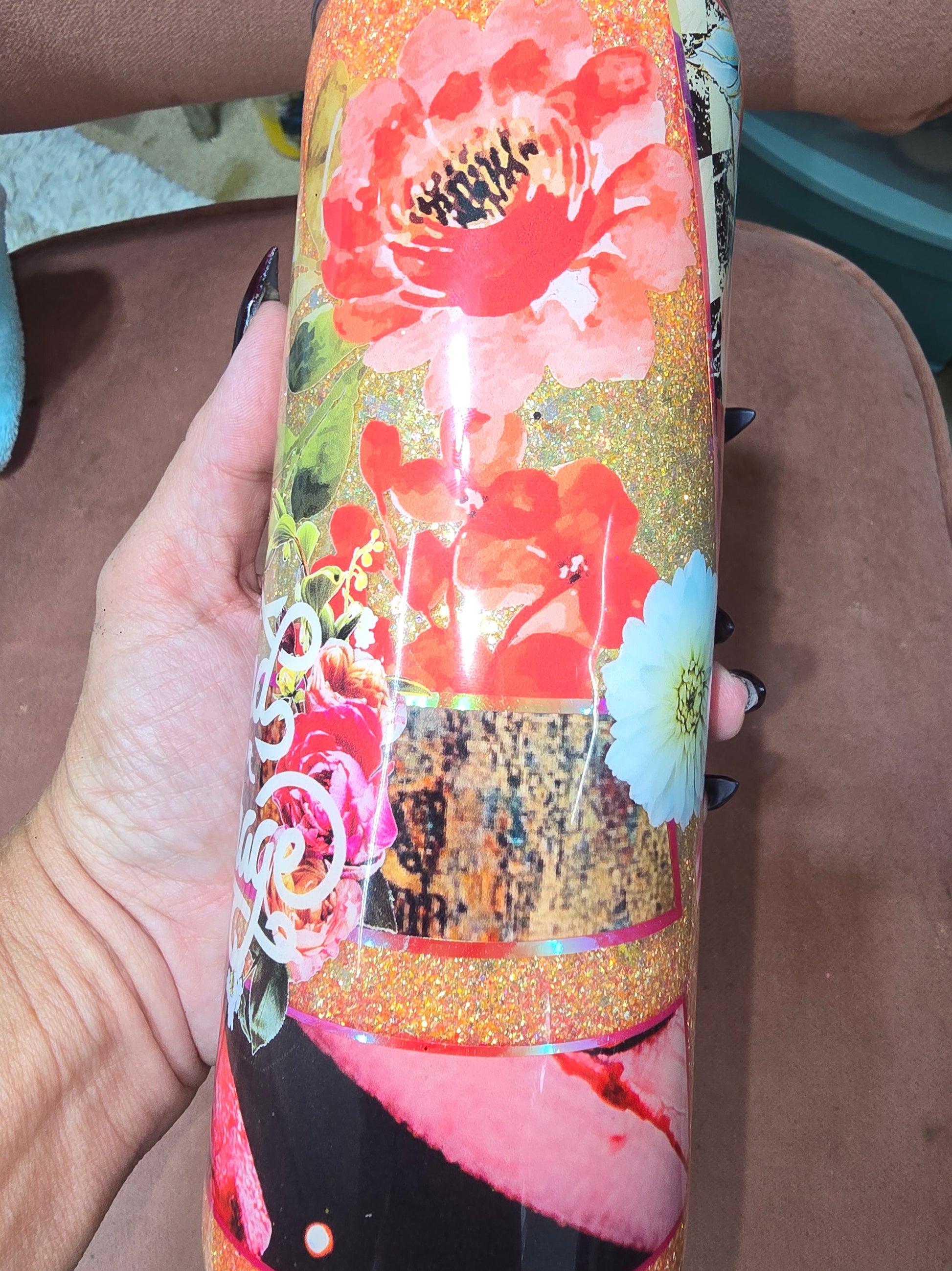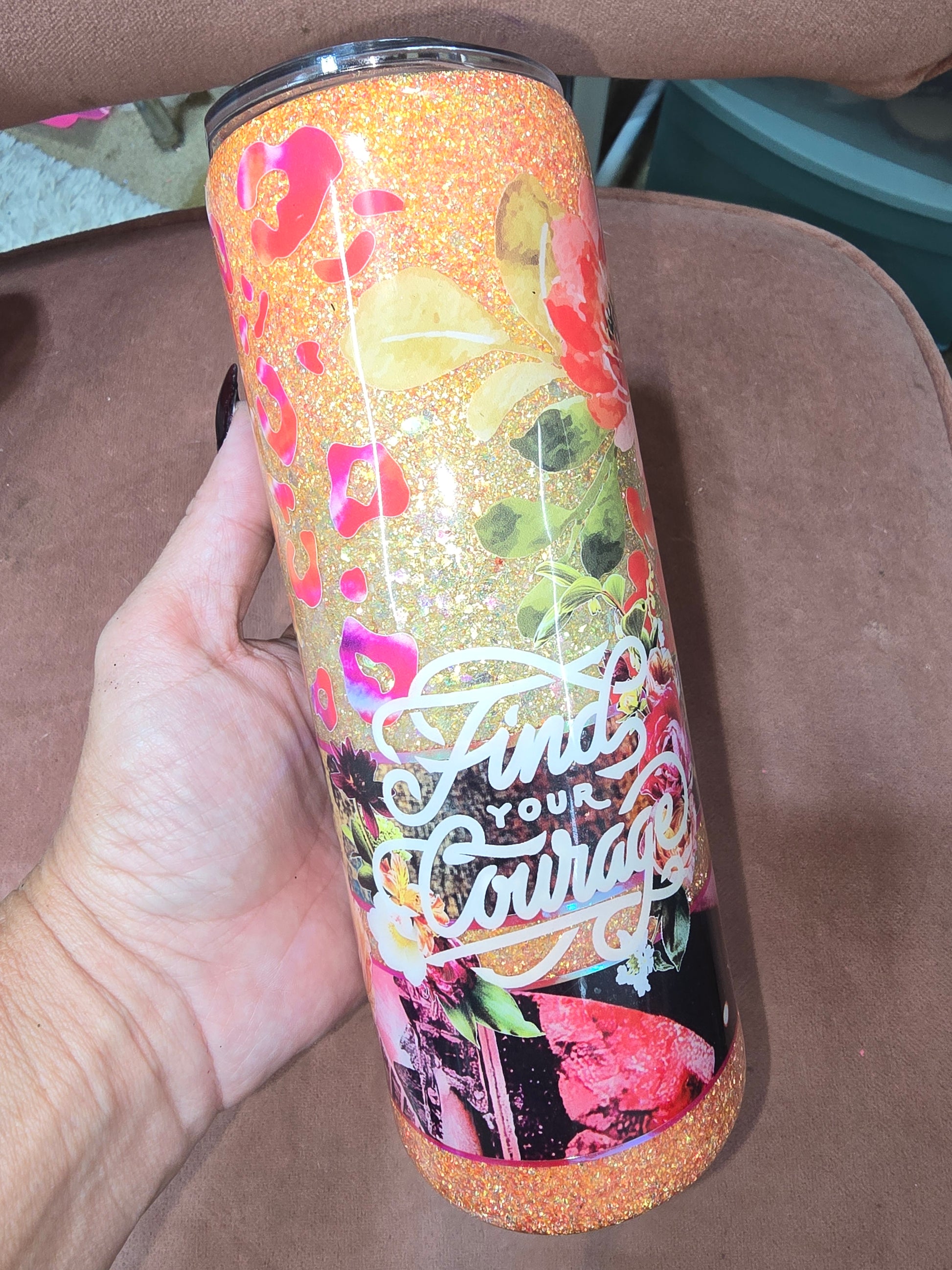 Shine bright and stay inspired with this 20oz Stainless Steel Tumbler, featuring a dazzling golden glitter base, vibrant florals, and the uplifting message “Find Your Courage.” Perfect for everyday motivation, this cup blends sparkle, beauty, and function in one.