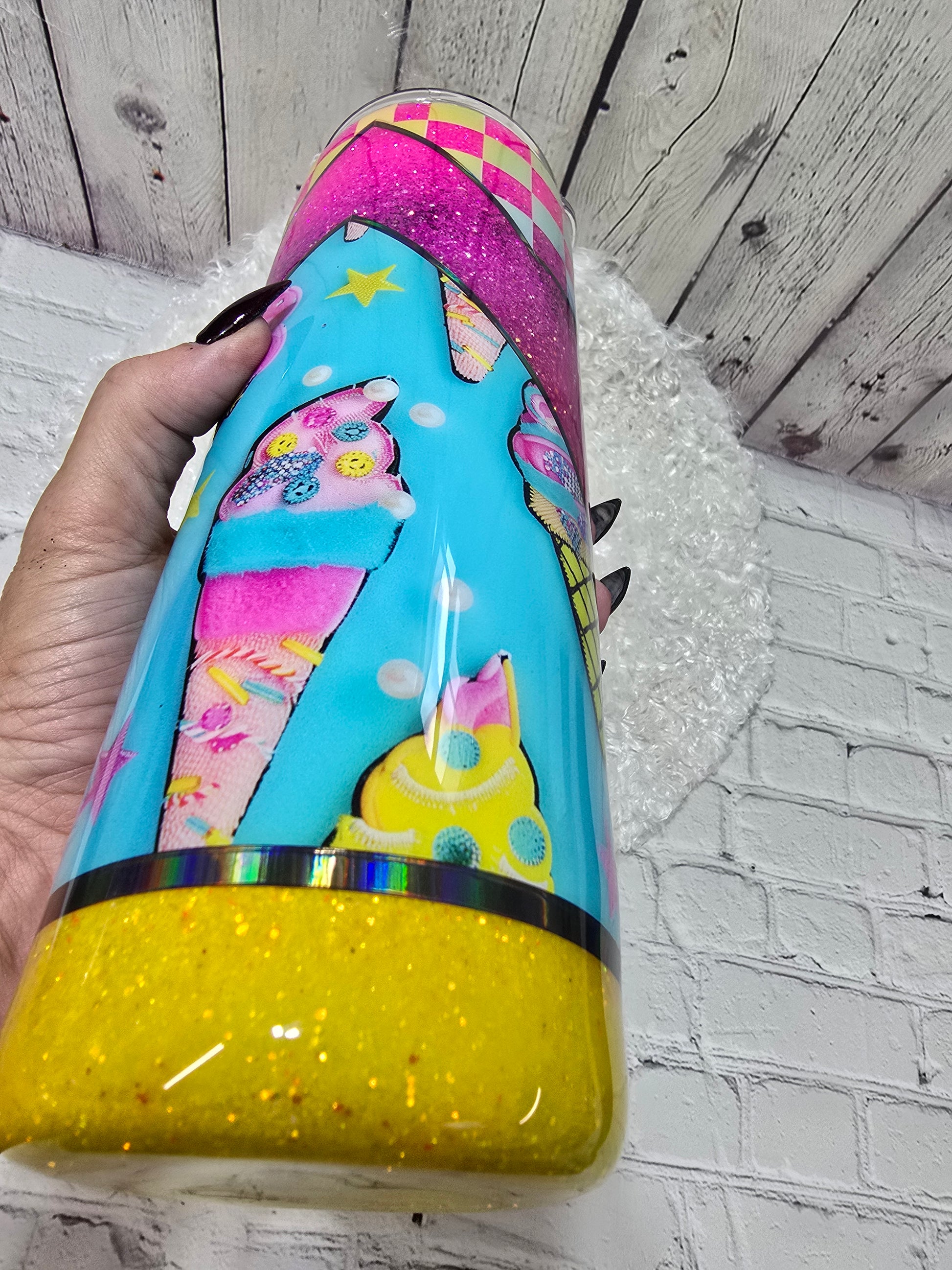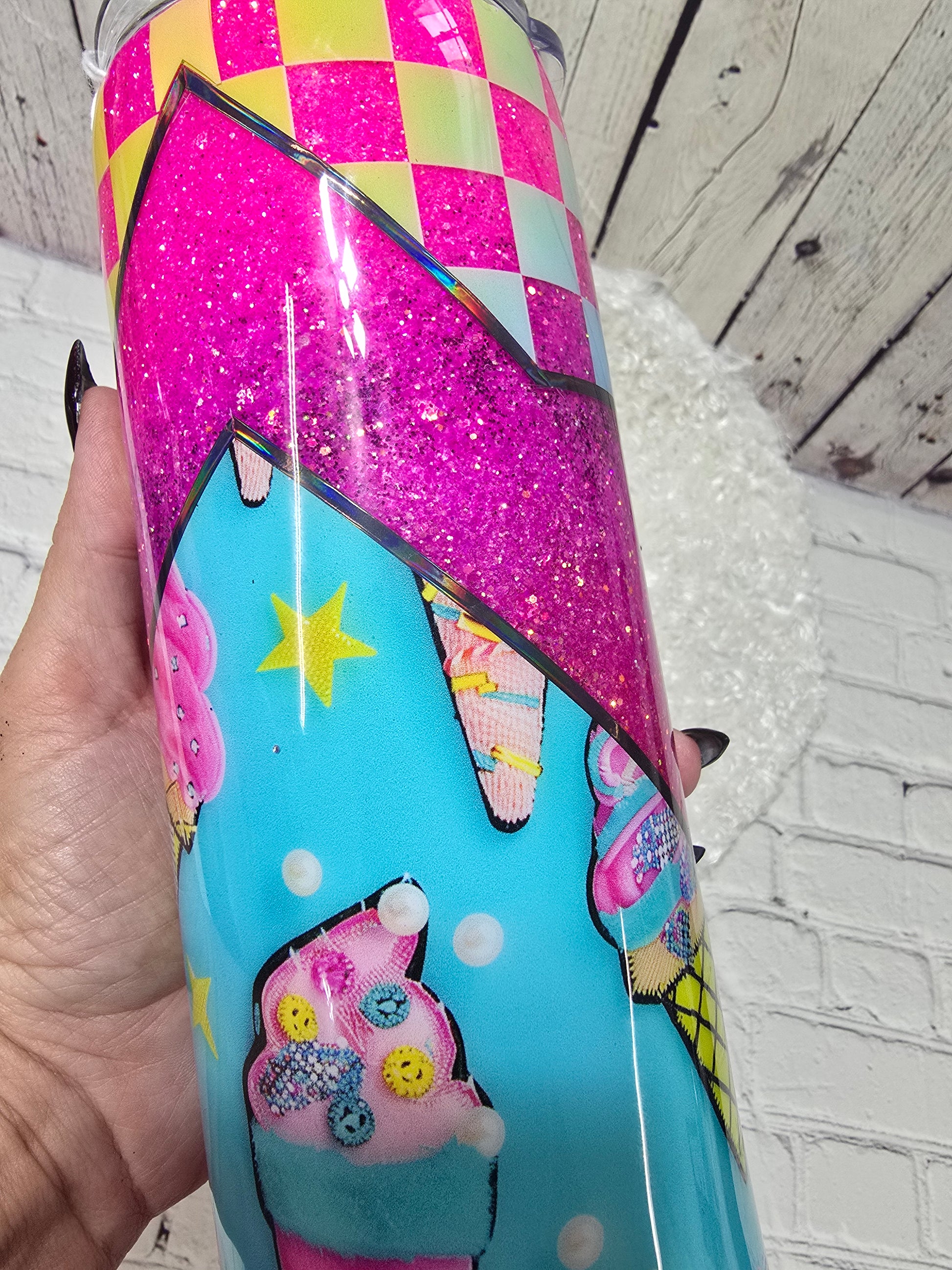Bright, bold, and full of good vibes—this 30oz Stainless Steel Tumbler is the perfect treat for your everyday routine. Featuring a vibrant glitter base, playful pink-and-blue checkerboard detail, and a colorful stacked ice cream cone with the phrase “It’s a Sweet, Sweet Life”, this cup is pure happiness in your hand.